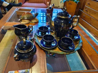Elegante juego de café antiguo con un profundo color azul cobalto y decorado en plata. - Incluye tetera, azucarero, lechera y 6 tazas con sus platos. - Diseño clásico y refinado.