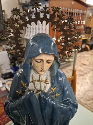 Figura religiosa de la Virgen de Olot,de pasta de madera representando a La Dolorosa. Una pieza con gran detalle. Medidas 56 cm altura total y de los pies a la cabeza sin peana y sin corona 48 cm - Figura de la Virgen de Olot. - Representación de La Dolorosa. - Detalle de espadas en el pecho.