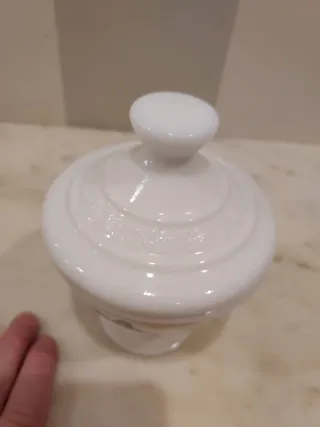 Tarro antiguo de vidrio blanco con tapa. Presenta un diseño decorativo con figuras en azul. - Material: Vidrio. - Color: Blanco con detalles en azul. - Incluye tapa.