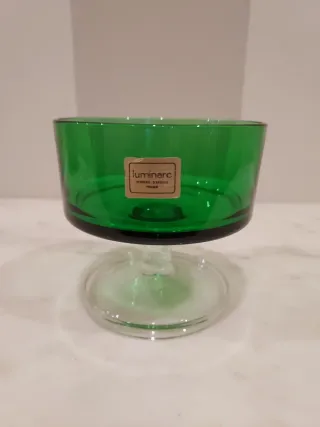 Elegante copa de cristal verde de la marca Luminarc, con un diseño que evoca la década de los 70. Es una pieza nueva, lista para añadir un toque de estilo a tu mesa. - Color: Verde. - Marca: Luminarc. - Época: Años 70. - Estado: Nuevo.