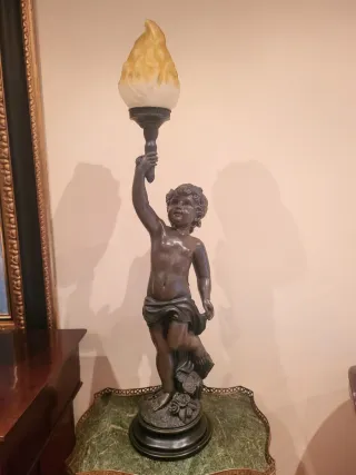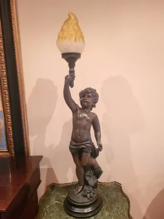 Elegante lámpara antigua con figura de querubín portando una antorcha. - Base decorada con motivos florales. - Figura de querubín en bronce o material similar. - Pantalla con forma de llama.