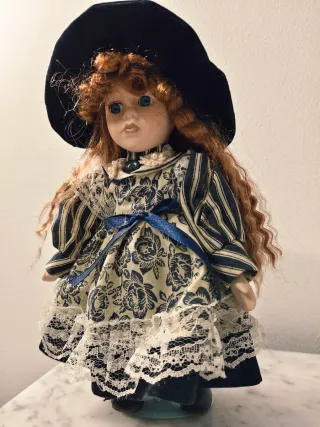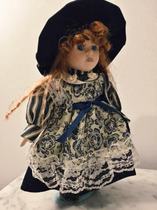 Preciosa muñeca antigua con detalles de época. - Vestido con estampado floral y encaje. - Sombrero negro. - Pelo largo y rizado.