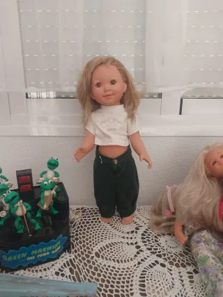 Muñeca antigua de la marca Miyo. - Vestido blanco con detalles. - Pantalones verdes. Sin arañazos
