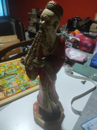 Figura decorativa de un anciano chino tocando una flauta de pan, tiene varias reparaciones figura completa sin manchas mide 40x14 centímetros y 1248 gr. Data de los años 70 en yeso, hago envíos