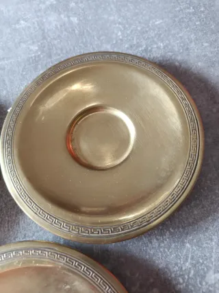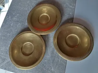 Conjunto de tres platillos vintage de latón con un diseño decorativo en el borde diferentes,sin roturas ni manchas miden 13 centímetros de diámetro y 184 gr. Hago envíos Ordinario:3'80€ Certificado:8'5€ o wallapop envíos