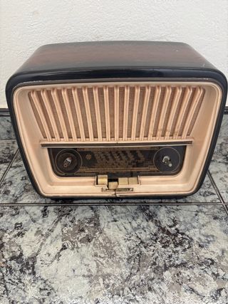 Radio antigua con un diseño clásico y elegante, perfecta como pieza decorativa. - Carcasa en tonos madera y negro. - Frontal con rejilla y dial. - Mandos y botones frontales.