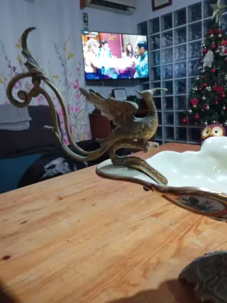 Elegante centro de mesa con base de bronce y cuenco de porcelana. - Diseño con aves decorativas. - Detalles dorados y pintados a mano.