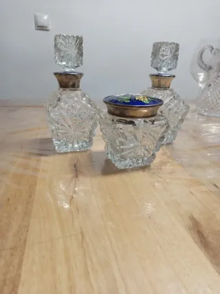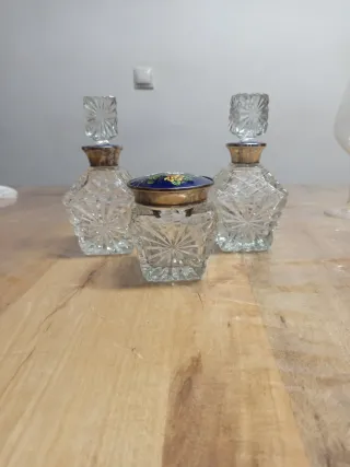 Elegante conjunto de tres piezas de plata y cristal de Bohemia. Ideal para coleccionistas o como pieza decorativa. - Dos frascos de perfume con tapón tallado. - Un frasco con tapa decorada en azul y dorado.