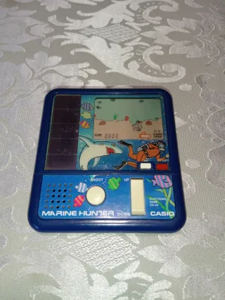 Consola de juegos electrónica portátil de Casio. - Modelo: Marine Hunter CG-50. - Diseño azul con temática marina. - Botones de control: Shoot, Up, Down, Start.