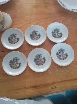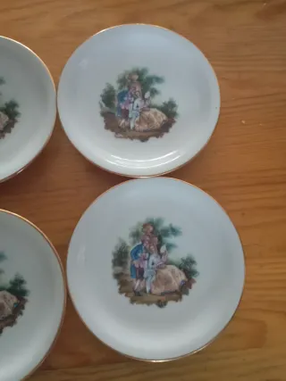 Conjunto de seis platos antiguos con un diseño decorativo. - Cada plato presenta una escena con figuras. - Borde dorado. - Ideales para coleccionistas o decoración.