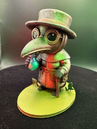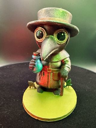 Figura decorativa de un médico de la peste con su característico sombrero y máscara. - Detalle de la máscara con forma de pico. - Sostiene un frasco en una mano y un bastón en la otra. - Base ovalada. - impresión 3D en resina y pintado a mano.