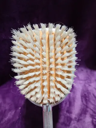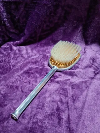 Elegante cepillo antiguo con mango de alpaca y cerdas naturales. - Mango con diseño acanalado. - Cerdas suaves y densas. (Probablemente jabalí o caballo). - Base de madera. - Made in England. - Fecha de fabricación: Entre 1920 y 1945. Para más artículos visitar mi perfil. #Plata #Vintage #Peine #Tocador #Coleccionismo #Antigüedad #Cabello #Clásico #Reina #Princesa