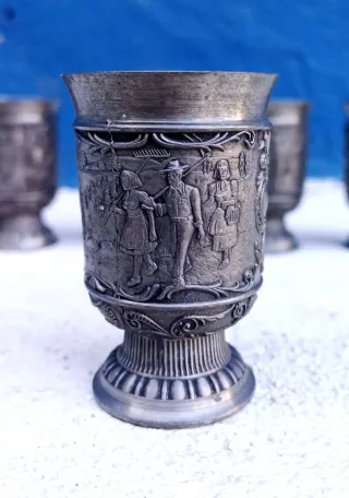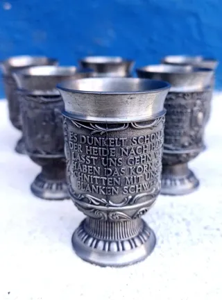 Conjunto de 6 vasitos alemanes en estaño 95% (Rein Zinn), con pie y decoración en relieve. Presentan escenas tradicionales centroeuropeas y texto en alemán grabado. Algunos relieves parecen variar ligeramente entre piezas. ✔ Sello original en el interior ✔ Estaño 95% ✔ Trabajo en relieve de gran detalle ✔ Piezas pesadas y de buena calidad ✔ Años aproximados: 1960–1980 📏 Medidas: • Altura: 6 cm • Diámetro (boca): 3,5 cm Ideales para colección, decoración rústica, chalet alpino o ambiente tipo cervecería alemana o una cena con temática Game of thrones.