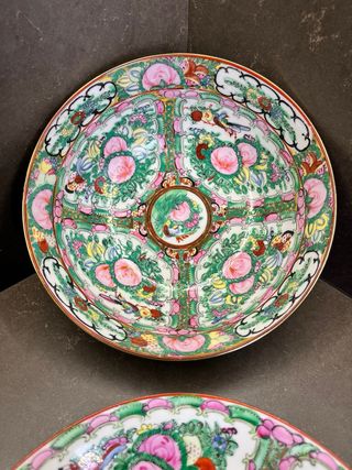 CUENCO / ENSALADERA + PLATO GRANDE PORCELANA CHINA MACAO. ANTIGUEDAD rescatada del baúl de la abuela. Finales S. XIX. Pintado y decorado a mano con motivos florales y pájaros. Líneas en oro. Con firma. Medidas: cuenco (23 cm diámetro x 10 altura) plato (24 cm diámetro × 5 altura). Cuenco en pertecto estado; plato con pequeña muesca en el canto (ultimas 2 fotos). Solo usados como decoración en vitrina cerrada. NO NEGOCIABLE. HAGO LOTES Y ENVÍOS POR WALLAPOP *****;l!No dudes en entrar en mi perfil, hay de todo un poco...!