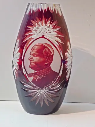 Elegante jarrón de cristal tallado con un detallado retrato grabado. - Material: Cristal tallado. - Color: Rojo y transparente. - Diseño: Retrato grabado de Juan Pablo II. - Decoración: Motivos florales tallados.