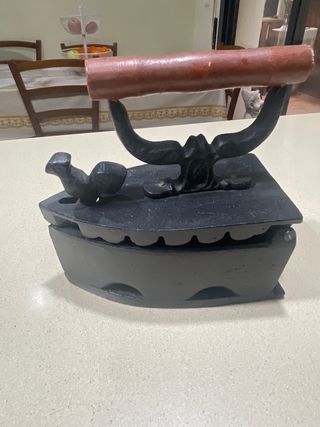 Plancha antigua de hierro fundido con mango de madera. - Diseño clásico. - Material: Hierro fundido y madera.