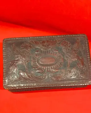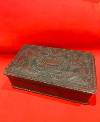 Preciosa caja antigua decorada con motivos florales y figuras. - 28x 12 X 6 cm. - Elaborada en madera y piel. - Diseño grabado. - Ideal para coleccionistas.