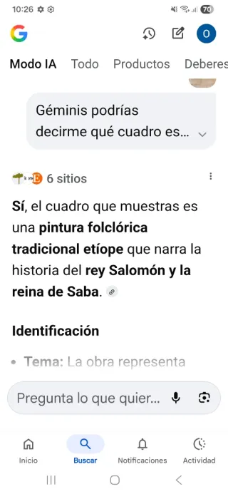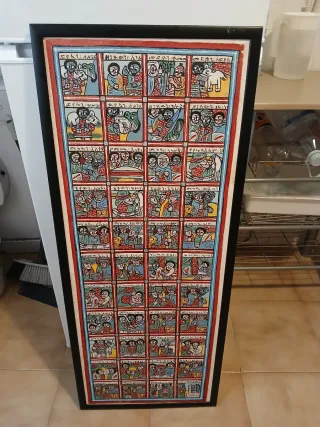 Cuadro de estilo etíope con múltiples escenas representadas en viñetas. - Marco negro. - Bordes decorativos en rojo y azul. - Pintura detallada con figuras y texto en escritura etíope. Representa las escenas del Rey Salomón la reina de Saba y el nacimiento de su hijo Medellín I. Aunque la obra no tiene ninguna firma es totalmente auténtico y antiguo. No s.m.s , no envíos, no negociable el precio. Imteresad@ recoger la obra en mi domicilio, pago enefectivo. Atiende José. 688 14 20 14.