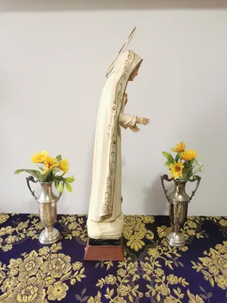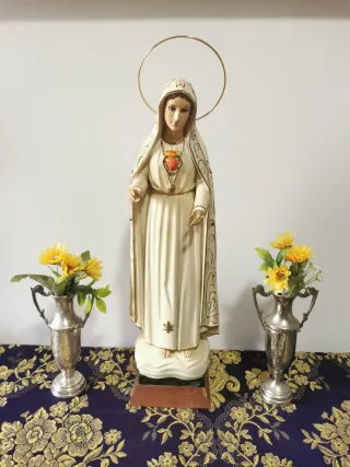 Figura de la Virgen de Fátima con el Sagrado Corazón. - Altura de 46 cm. - Detalle del Sagrado Corazón en el pecho. - Halo dorado. - Base de madera.