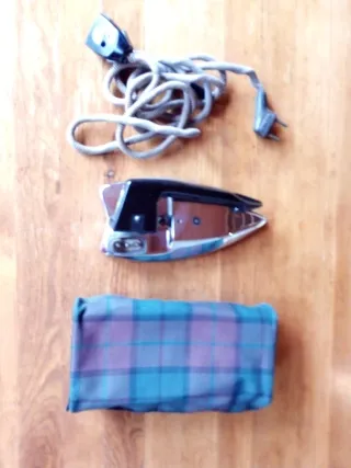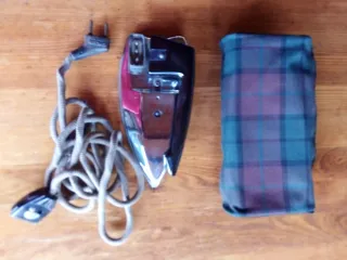 Plancha de viaje antigua con su funda de tela a cuadros. - Diseño clásico y compacto. - Cable de alimentación enrollado. - Funda de tela con estampado a cuadros.
