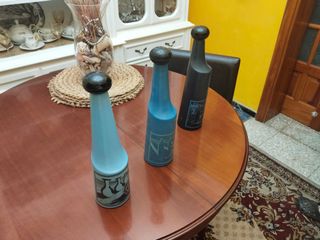Conjunto de tres botellas decorativas Salvador Dalí ORIGINALES - Diseño artístico con motivos surrealistas. - Acabado en tonos azul claro y oscuro. - Tapones en forma de esfera.