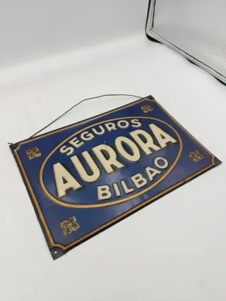 Placa antigua de Seguros Aurora de Bilbao. Un objeto decorativo con un diseño clásico. - Material: Metal esmaltado. - Color: Azul con detalles dorados y letras en relieve. Tiene desgaste por el tiempo Medidas: 16,5 x 24,6 cms (alto x ancho) Ref: SM Puedes verlo y recogerlo presencialmente en el Polígono de Raos, Santander. Tlf: 635153338. Abrimos las mañanas de Lunes a Sábado de 10 a 14h y las tardes de Lunes a Viernes de 17 a 20h.