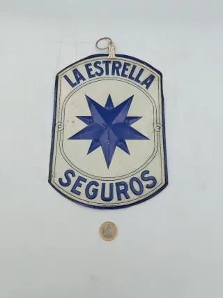 Placa antigua de La Estrella Seguros con un diseño distintivo. - Forma de escudo. - Estrella azul central. - Texto LA ESTRELLA y SEGUROS en azul. Tiene desgaste por el tiempo. Medidas: 23,2 x 16,4 cms (alto x ancho) Ref: SM Puedes verlo y recogerlo presencialmente en el Polígono de Raos, Santander. Tlf: 635153338. Abrimos las mañanas de Lunes a Sábado de 10 a 14h y las tardes de Lunes a Viernes de 17 a 20h.
