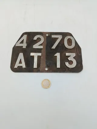 Matrícula antigua con números y letras grabados. - Material metálico. - Diseño rectangular con bordes biselados. - Presenta signos de óxido y desgaste propios del paso del tiempo. - Número en relieves. Tiene signos de desgastes. Medidas: 12 x 19 cms (alto x ancho) Ref: SM Puedes verlo y recogerlo presencialmente en el Polígono de Raos, Santander. Tlf: 635153338. Abrimos las mañanas de Lunes a Sábado de 10 a 14h y las tardes de Lunes a Viernes de 17 a 20h.