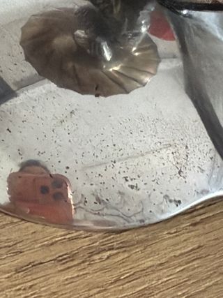 frutero antiguo con un diseño muy elaborado de alpaca plateada está en buen estado salvo que por dentro tiene marcas como se ven las fotografías de ahí su precio anchura máxima 39 cm fondo máximo 23 cm altura 17 cm al medio o 19 cm a los costados - Fabricado en alpaca plateada. - Base ornamentada. - Asas decorativas.