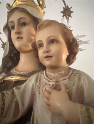 figura de principios del siglo XX virgen del Carmen la peana de madera y el resto es de material de la época que desconozco tiene una altura total de 62 cm tiene la corona la virgen y el niño está en perfecto estado salvo el dedo de la virgen y el cuello del niño que necesitan una pequeña restauraciónpieza bien conservada y bien trabajada, puesto que el manto de la virgen del Carmen parece de tela sin serlo en caso de envío se manda bien protegido, pero sin hacerme responsable de roturas en el envío, pero prefería que fueran en mano por la delicadeza y antigüedad de la pieza pago en mano o Bizum antes del envío