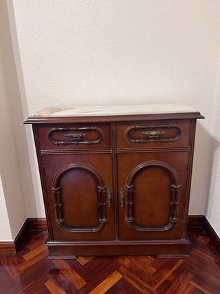 Mueble de estilo vintage con una elegante tapa de mármol. - Diseño clásico con detalles ornamentales. - Dos puertas frontales. - Dos cajones superiores.