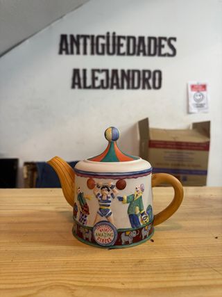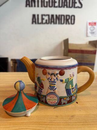 Tetera de porcelana con diseño de circo. - Decorada con personajes circenses y elefantes. - Tapa con diseño de carpa de circo. - Inscripción Christopher Wren's Amazing Circus.