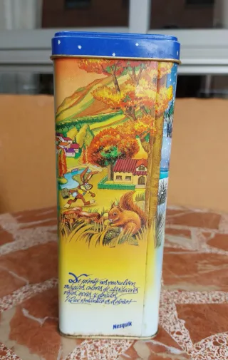 Lata metálica vintage de Nesquik Lata antigua de Nesquik aproximadamente de 1992 , pintada con las 4 estaciones climáticas muy bien conservada. Se pueden quitar las 2 pegatinas amarillas de Nesquik que tapa el invierno y el verano para ver mejor las 4 estaciones. En perfecto estado Medidas: 22×16×8 cm