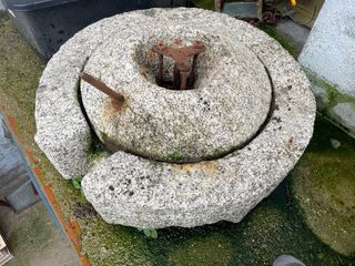 Pieza de molino de piedra para hacer harina, datada del siglo XVIII. Fabricado en granito, presenta un diseño circular con un eje central. - Material: Granito. - Época: Siglo XVIII.