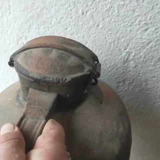 Antiguo cántaro de metal con asa y tapa. - Material: Metal. - Diseño tradicional.