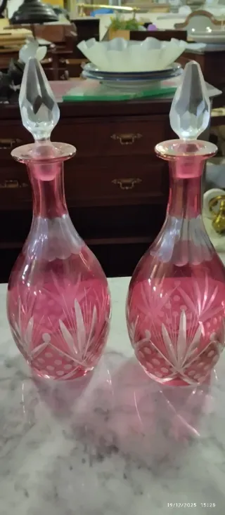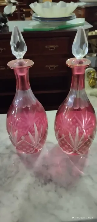 Conjunto de dos licoreras antiguas de cristal con un precioso diseño tallado. - Color rosa intenso. - Tapa de cristal facetado. - Decoración floral tallada en la base.