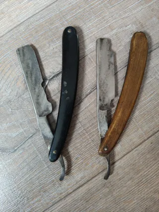 Se venden dos navajas de afeitar antiguas, cada una con un mango de diferente material y color. Perfectas para reutilizar alguna pieza. - Una navaja tiene mango negro. - La otra navaja tiene mango de madera.