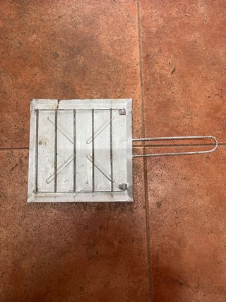 Tostador vintage de metal con asa. - Material: Metal. - Diseño cuadrado con rejilla. - Asa para sujetar y girar.