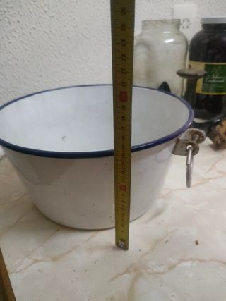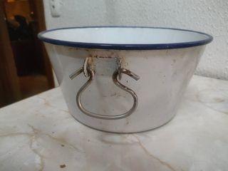 Barreño antiguo con un diseño clásico y dos asas para facilitar su transporte. - Material: Porcelana. - Color: Blanco con borde azul.
