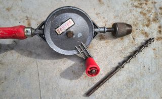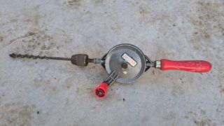 Berbequí manual de la marca vasca Zenten, fabricado en 1966 en Irún. Una herramienta clásica para trabajos de carpintería o bricolaje. El mecanismo funciona perfectamente. - Incluye broca original de la época para madera. - Mango de madera rojo. - Cuerpo metálico de hierro.