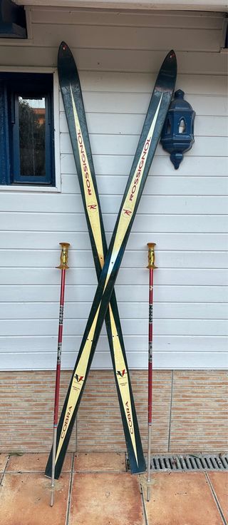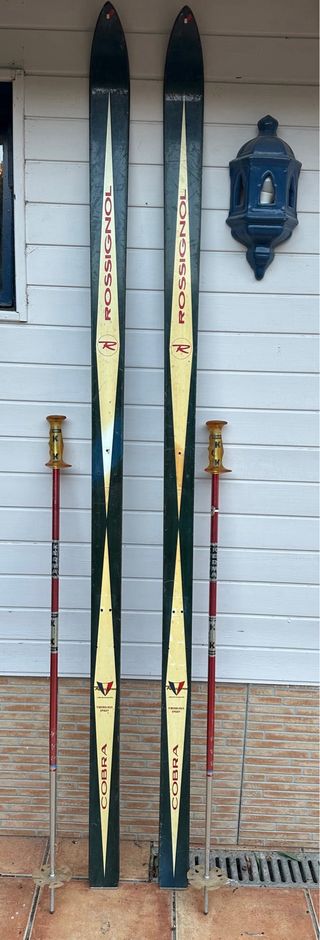 Conjunto de esquís vintage Rossignol Cobra Fiberglass de los años 70. Un clásico para coleccionistas o amantes del esquí retro. - Diseño icónico de la marca Rossignol. - Fabricados con tecnología Fiberglass. - Incluye bastones a juego con agarre dorado. - No incluye fijaciones