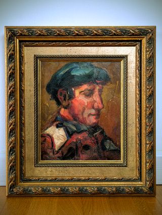 Pintura al óleo de estilo matérico que retrata a un agricultor. La obra se vende junto al marco de madera maciza, con marialuisa decorativa, y molduras dobles, en tonos dorados envejecidos. - 38 cm x 43 cm. - Pintura al óleo. - Marco incluido.