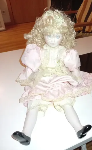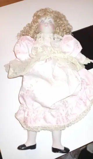 Preciosa muñeca de porcelana, ideal para coleccionistas. Luce un vestido antiguo de encaje blanco y detalles verdes. - Muñeca de porcelana con detalles delicados. - Vestido blanco con puntilla. - Zapatos a juego.