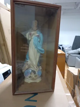 Figura de la Virgen María dentro de una vitrina con marco de madera. Antigua - La figura está sobre una base. - La vitrina protege la figura.