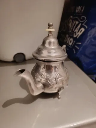 Tetera de plata con un diseño intrincado y elegante. - Material: Plata - Decoración detallada en el cuerpo - Base con tres patas - Tapa con un pequeño adorno