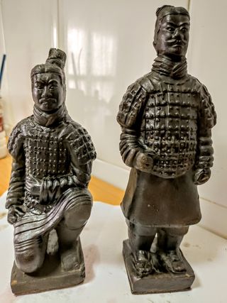 Conjunto de dos figuras decorativas inspiradas en los Guerreros de Terracota de Xian. Representan a dos soldados con armadura. Material resina de alta densidad y dureza, Nuevos