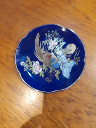 Pequeño plato decorativo de origen japonés. Presenta un diseño detallado con motivos florales y aves. - Color azul cobalto. - Borde dorado. - Diseño oriental.