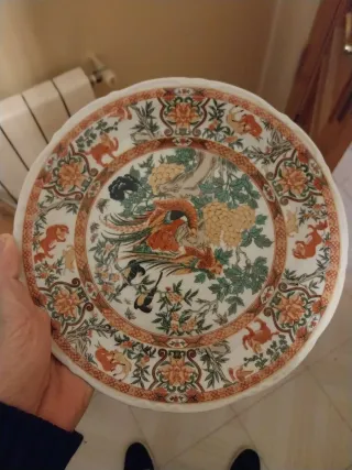 Precioso plato de porcelana con un diseño oriental. - Decoración detallada con aves y flores. - Borde con motivos ornamentales. - Ideal como pieza decorativa.