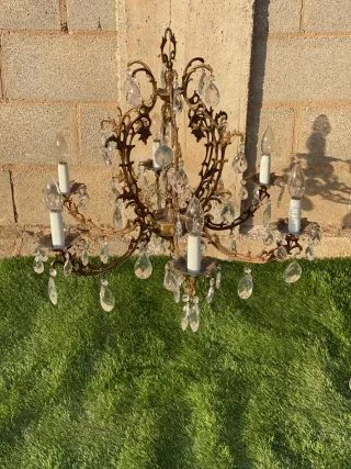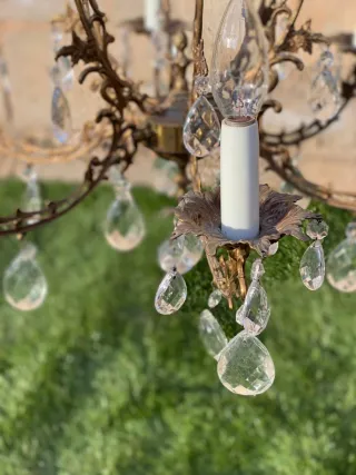 Lámpara de araña clásica de seis luces, fabricada en bronce decorada con colgantes de cristal tallado en forma de gotas y prismas. Diseño elegante de inspiración francesa, con brazos curvados y detalles ornamentales. Ideal para salones, comedores, entradas o estancias con decoración clásica, vintage o señorial. 📦 Posibilidad de envío, consulte por privado. Antigüedades oro bronce plata marfil vajilla museo mueble vintage retro clásico colección Ikea Leroy Merlín decoración estilo barroco rococo laton Arte iluminación relieve piezas forjado fundición historia patrimonio palacio interiorismo joyas artesanía mármol figura ju