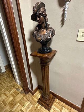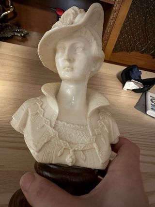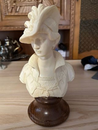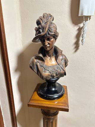 Elegante busto de mujer con un diseño detallado y un sombrero adornado con plumas. Se escuchan ofertas